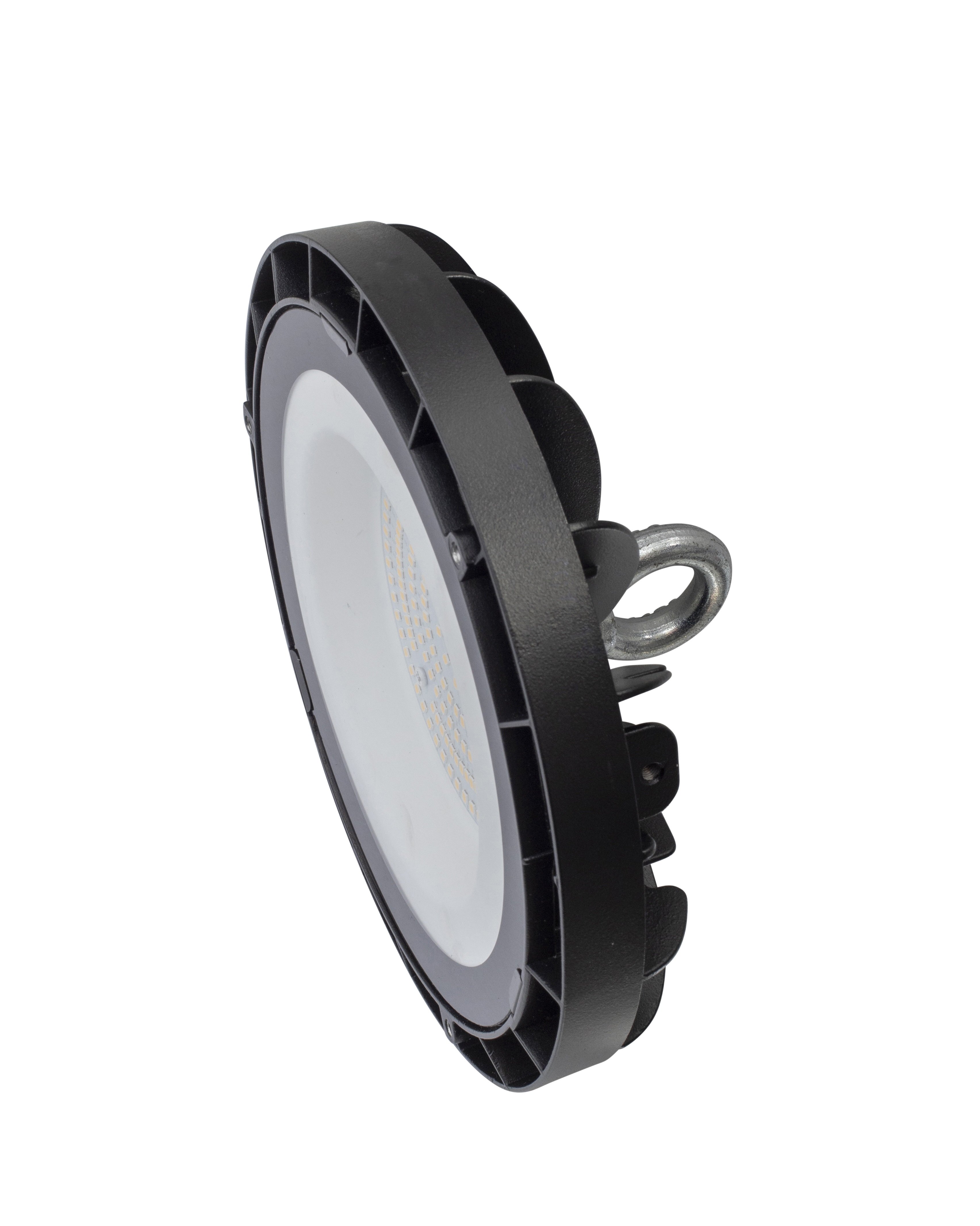 Deze high bay-armatuur heeft een behuizing van spuitgietaluminium met een polycarbonaat front.